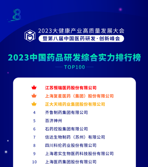 由药智网、中国药业杂志社主办的2023大健康产业高质量发展大会暨第八届中国医药研发•创新峰会于6月16日开幕,会上发布了《2023中国药品研发实力排行榜》系列榜单,AG视讯医药凭借深厚的创新研发实力再创辉煌:荣登《2023中国药品研发综合实力排行榜TOP100》榜首、《2023中国化药研发实力排行榜TOP100》榜首。值得一提的是,今年是AG视讯医药连续第6年入选《中国药品研发综合实力排行榜》榜首。